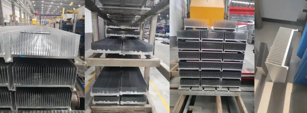 Extrusion Process: Use a hydraulic press exerting 15,000 tons of pressure to push the aluminum billet through the die, forming the desired heat sink shape. Quench the extruded product with a water bath or fans, then shear it to length and cool to room temperature.