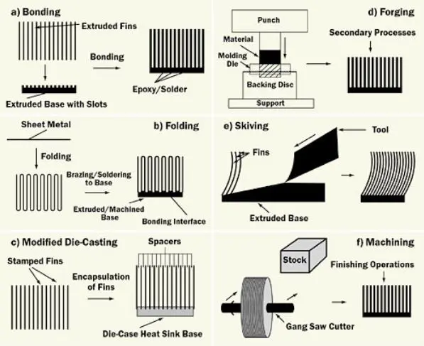Stamped Aluminum Heat Sink: Made by stamping metal fins and soldering them to a base, these heat sinks are low-cost, automated, and suitable for low-power applications, but offer low performance.